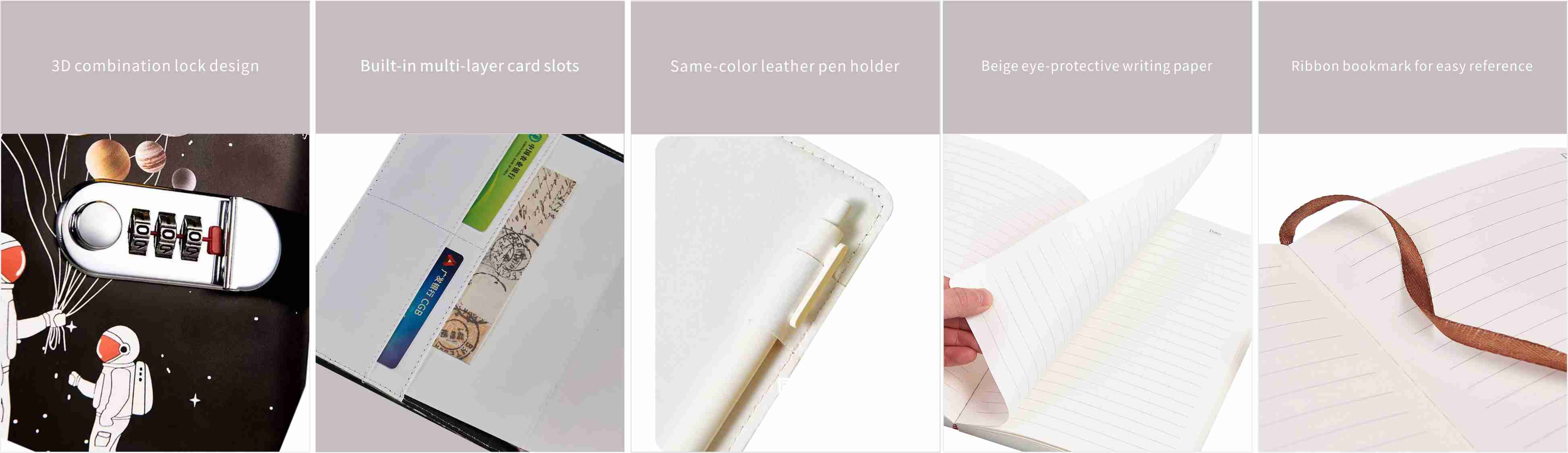 Замок клавиша дневника, этот дневник оснащен металлическим комбинацией, который поддерживает 0-9 трехзначных комбинаций и имеет различные комбинации паролей. Вы можете настроить функцию пароля, а обложка разработана с пространственной темой, охватывающей различные художественные стили. Эти детские и мечтательные узоры не только делают дневник красивым, но и добавляют вам счастливое настроение при записи, как будто вы начинаете фантастическое космическое приключение. Он также имеет функцию вставки ручки и внутреннего кармана, что удобно для хранения небольших предметов.