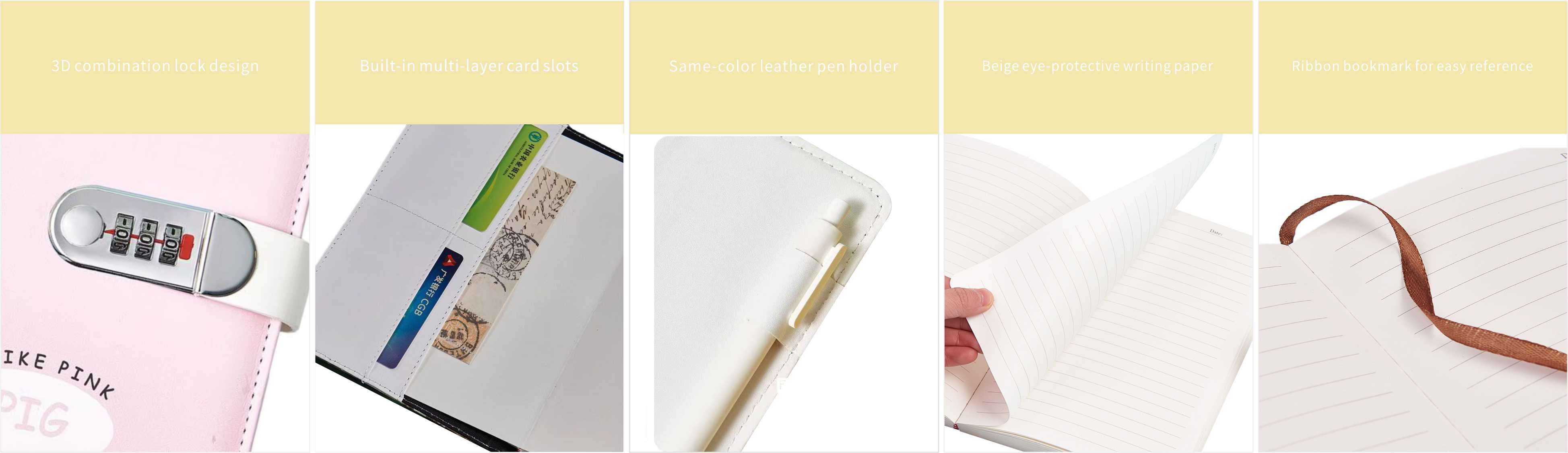 Этот дневник с блокировкой пароля предоставляет множество милых узоров обложки. Независимо от того, какой стиль вам нравится, вы можете найти здесь свой любимый выбор. Он также оснащен прочной и прочной металлической блокировкой пароля. Вы можете установить уникальный пароль самостоятельно, чтобы убедиться, что только вы можете открыть его и прочитать внутреннюю страницу, обеспечивая надежную защиту для вашей конфиденциальности и важной информации. Чтобы сделать вам удобным для записи ваших идей в любое время, наш дневник также вдумчиво устанавливает положение ручки. Он может удерживать ручку, так что вы можете поставить запись в ручку в любое время, когда она вам понадобится. Другая выдающаяся особенность - его функция внутренней сумки. Этот дневник с блокировкой пароля оснащен несколькими карковыми розетками и внутренними карманами, что позволяет вам аккуратно хранить банковские карты, удостоверение личности, членские карты, квитанции и другие предметы, и вам больше не нужно беспокоиться о потере этих важных предметов.